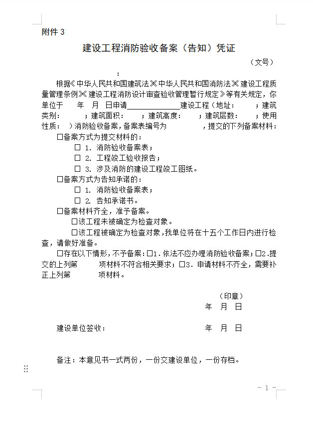 (二)辦理環節。建設工程消防設計審查驗收主管部門對建設單位提交的申請材料進行形式審查。申請材料齊全且符合法定形式,出具備案憑證。申請材料不齊全或者不符合法定形式的,一次性告知建設單位需要補正的全部內容。